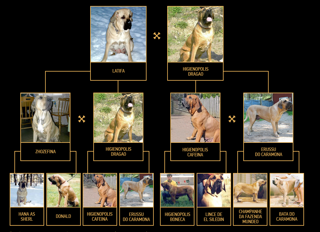 На мой взгляд очень интересно знать происхождение своей собаки, надеюсь это будет так же интересно владельцам наших детей, да и не только. Многие смогут найти здесь интересную информацию, может быть даже что-то новое для себя. Некоторые наши дети были получены путем спаривания сук, в роду которых у многих есть один и тот же предок с нами - это Higienopolis Dragao (находясь в разных коленах) таким образом мы получали пометы, делая инбридинг умеренный (когда родители щенков, говоря человеческим языком, двоюродные или троюродные братья-сестры) и отдаленный инбридинг - когда общий предок встречается в 4-5 поколениях, то есть, фактически за пределами родословной (за пределами, потому что, обычно делается родословная до 3 колена и по-желанию до 4), хотя в самого щенка входит куда больше колен.