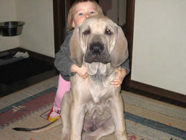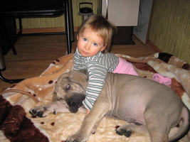 Забрали мы его в возрасте 1.5 месяцев, комочек счастья весов 10 кг, отвозя его домой, я не могла поверить своему счастью, этот день наступил и вот он наш малыш, который должен будет вырасти в большого кобеля, похожего на папу. Рос Буцефал вместе с дочкой, так что в доме было уже два ребенка. Периодически малыш находил игрушки малой, а та бегала их отнимать обратно. Пришлось учить обоих сразу. Развивался он очень хорошо, очень быстро рос, менялся с каждым месяцем и становился все больше. К году он стал очень высоким и крепким (75 см в холке), учились мы правда многому, так как новая порода требует новых знаний и навыков, начиная от воспитания до питания, социализации, общения с другими собаками и много чего еще. Выращивание крупной собаки дело не простое, требующее времени, сил, знаний и не малых вложений. Приходилось читать, узнавать, применять на опыте и воплощать, иногда делая ошибки, которые потом исправлял. Но постепенно мы научились понимать породу, правильно воспитывать, контролировать, сдерживать агрессию (недоверие ко всем чужим). Мы учили Буца, а он нас. Конечно, только проживя с собакой не один год, ты узнаешь, в чем изюминка породы, все ее светлые и темные стороны (образно, но свои минусы конечно же есть, как и в любой породе, самый главный например - это слюни, особенно, когда на кухне запахи или кто-то ест).