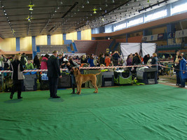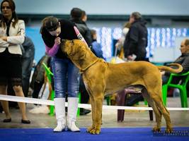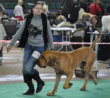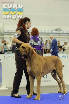 В 2015 году мы закрыли свой титул Интерчемпиона, тем самым закрыв свою мвыставочную карьеру. Стали жить спокойно без выставочных волнение. Но так получилось, что в 2017 году, в первые на Украине проходила масштабная Международная выставка собак "Euro Dog Show 2017", организатором которой являлся Кинологический Союз Украины. Проходила выстава в Киеве, взвесив все за и против, я решила все же посетить ее. На тот момент Эскальде было 5.5 лет, мне очень захотелось вспомнить выставочную атмосферу, показать собаку взрослую, скажем так, память для потомков оставить. Эскальдо имел отличную физическую форму, хорошую кондицию, как для выставки. Сходили посмотреть на других и себя показать. Многие эксперты привыкли совсем к другому типу собак, судят их у себя на родине и в других странах, как правило, выигрывают собаки более низкие, загруженные, к которым эксперты привыкли и отдавали предпочтения. Самое главное это участие, чему мы и последовали. Мы оказались в одном ринге с кобелем из Италии, он был намного ниже нас, скажем так другого типа, хоть мы и проиграли ему, зато оказались самыми темпераментными, не растеряв породные качества. Возле ринга работал фотограф, поэтому у нас сохранились несколько фотографий, так же есть видео (его можно будет посмотреть в разделе "видео"). Больше фотографий с выставок можно увидеть в отдельном альбоме.